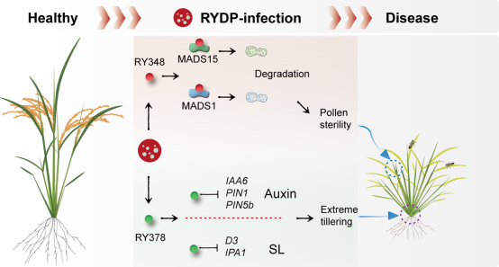 该研究发现了两个关键的毒力效应蛋白——RY348和RY378,并详细解析了其致病机制。RY348是一个小型分泌蛋白,通过破坏水稻中关键的MADS-box转录因子,导致花粉不育,直接影响水稻的生殖系统。RY378则通过干扰独脚金内酯(Strigolactone)和生长素(Auxin)信号通路,显著增加水稻的分蘖数量。研究表明RY378能够下调水稻中控制分蘖的基因表达,显著增强水稻的分枝能力,甚至在模式植物烟草(Nicotiana benthamiana)中也引发了类似的病害症状。