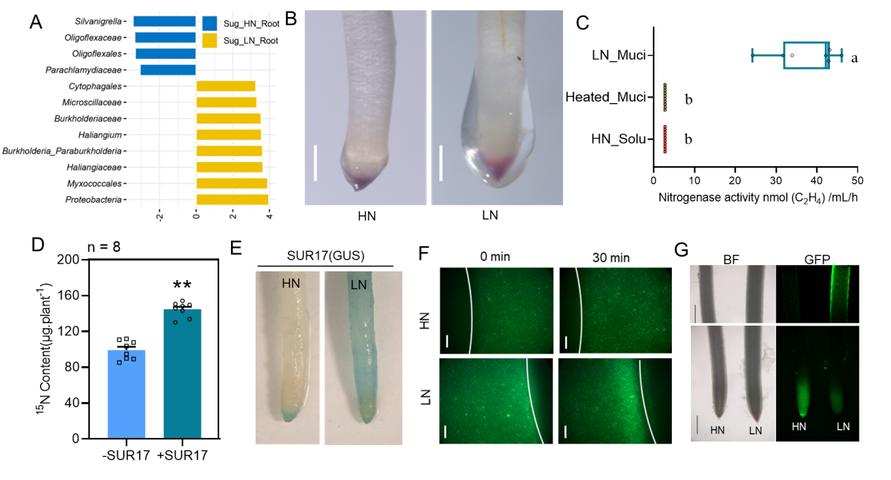 该研究首先在田间条件下发现,低氮处理显著提高单子叶作物根系Burkholderia_Paraburkholderia 的相对丰度。低氮处理还促进甘蔗根尖黏液形成,且黏液具有较强的固氮酶活性。同时从甘蔗根部分离获得联合固氮菌SUR17,进行荧光标记。进一步研究发现,低氮促进 Paraburkholderia SUR17对黏液的趋化作用及其在根系的定殖。