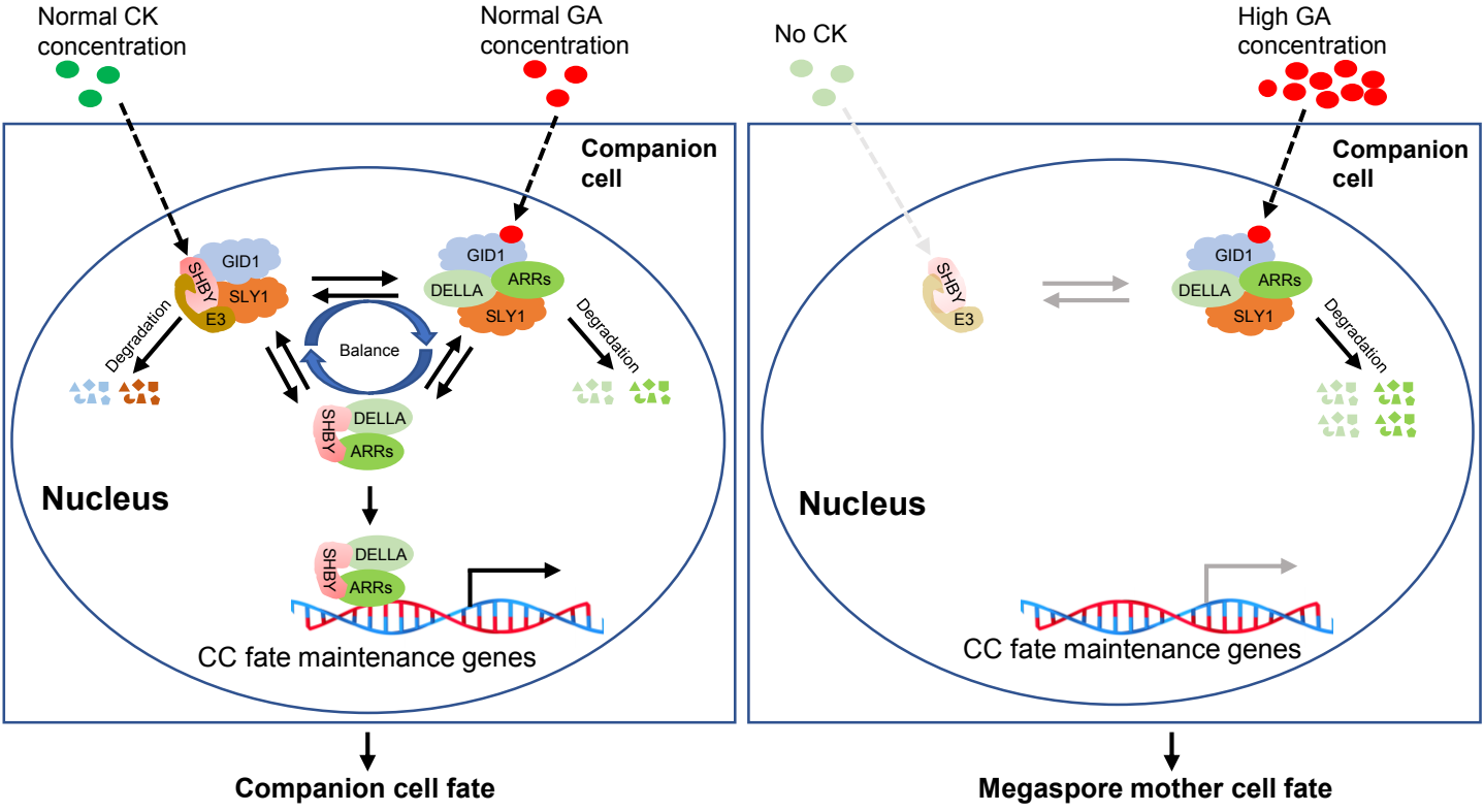 图 1. 赤霉素信号和细胞分裂素信号拮抗调控大孢子母细胞特化的工作模型