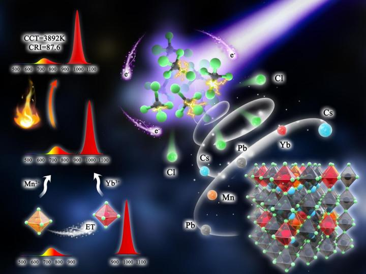 成果一是围绕全无机钙钛矿纳米晶CsPbCl3:Mn/Yb的可见-近红外发光二极管(Vis-NIR-LED)制备和应用,提出了一种简单、高效的光诱导合成方法,利用四氯化碳作为卤素源,在室温下制备CsPbCl3:Mn/Yb纳米晶,通过Mn的发射(4T1g→6A1g)与Yb的发射(2F5/2→2F7/2)之间的能量传递关系,实现了Yb于980nm的负热猝灭发光,解决了由全无机钙钛矿纳米晶固有的低热/氧/湿稳定性和严格的合成工艺限制其实际应用的问题。