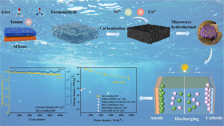 成果二是提出了一种简单而强大的自下而上的合成方法,采用MXene、NiCo-LDH和基的单宁冷冻凝胶,通过微波辅助水热共组装工艺制造 3D 分层交织NiCo-LDH@MT基电极。所得的NiCo-LDH@MT电极在1A﹒g-1的电流密度下表现出1210.55F﹒g-1的出色比电容,以及令人印象深刻的80.05%倍率能力,而纯NiCo-LDH电极为53.3%。使用 NiCo-LDH@MT作为正极和MXene-TPUF作为负极组装的非对称超级电容器器件在946.5 WKg-1的功率密度下表现出48.22 WhKg-1的高能量密度。此外,这些器件在10 A g-1下循环10,000次后,实现了93.2%的显着容量保持率和100%的库仑效率。基于NiCo-LDH@MT的非对称超级电容器具有出色的比电容、长期稳定性以及出色的能量和功率密度,凸显了其在储能应用中的巨大潜力。