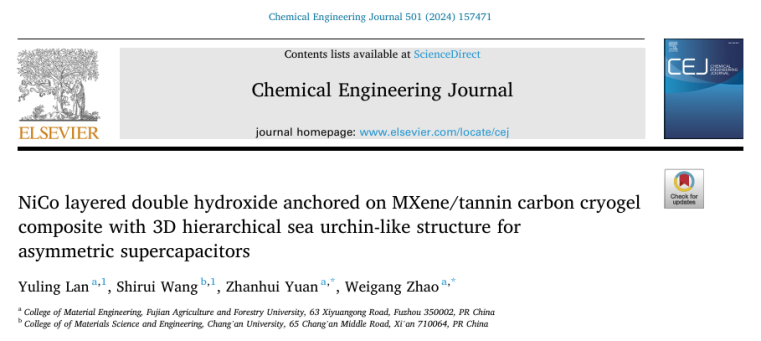 12月1日,该论文以“NiCo layered double hydroxide anchored on MXene/tannin carbon cryogel composite with 3D hierarchical sea urchin-like structure for asymmetric supercapacitors”(镍钴层状双羟基锚锭带有3D海胆分级结构并用于非对称超级电容器的单宁碳凝胶复合材料)为题发表于国际化工领域顶级期刊Chemical Engineering Journal,永利集团88304官网在线登录为第一单位,硕士研究生蓝钰玲为第一作者,袁占辉教授和赵伟刚副教授为通讯作者。