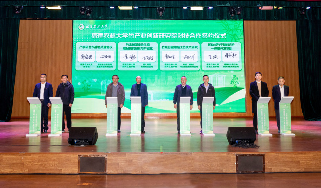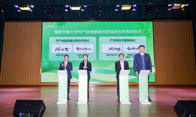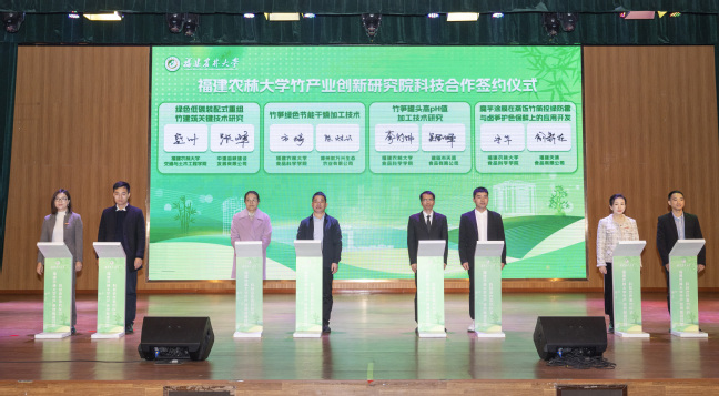 赖海榕代表学校致辞。他指出,成立竹产业创新研究院,是永利官网贯彻落实习近平生态文明思想和省委十一届七次会议精神,推动人才链、产业链、创新链“三链融合”,精准服务福建乡村振兴和绿色发展战略的重大举措,是校党委校行政深入调研、反复酝酿、科学论证后作出的战略决策。在新的起点上,学校将扎实推进竹产业创新研究院建设,着力打造竹产业科技创新高地,解决好限制我省竹产业发展的关键技术瓶颈,提升我省竹业科学研究水平和竞争力,推动竹产业新质生产力发展;着力打造竹产业人才集聚高地,引育一批竹产业领域的中青年学术骨干,培育一批带不走的“竹乡英才”,为我省竹产业高质量发展提供有力的人才支撑;着力打造竹科技成果转化高地,加强校地校企“产学研用”合作,提升竹产业成果转化应用水平,推动我省竹产业高质量发展,为奋力谱写中国式现代化福建篇章作出新的更大贡献。