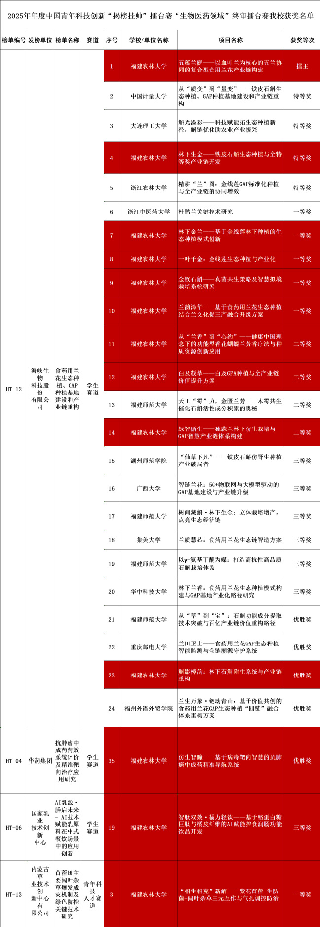 牢记嘱托,奋勇争先。在全校师生深入学习贯彻习近平总书记给学校全体师生重要回信精神之际,永利官网师生在第十九届“挑战杯”竞赛2025年度中国青年科技创新“揭榜挂帅”擂台赛“生物医药领域”终审擂台赛过关斩将、展现风采、荣获佳绩,实现永利官网获奖等级与数量历史新突破。学校首次夺得擂主,13件入围作品悉数斩获奖项,其中擂主1个、特等奖1个、一等奖5个、二等奖3个、三等奖1个、优胜奖2个。特别是在“HT-12食药用兰花生态种植、GAP种植基地建设和产业链重构”榜题中,勇夺擂主单位,充分彰显永利官网在兰科植物研究的深厚积淀。比赛期间,校党委副书记曾华平一行专程前往关心看望并指导参赛师生。