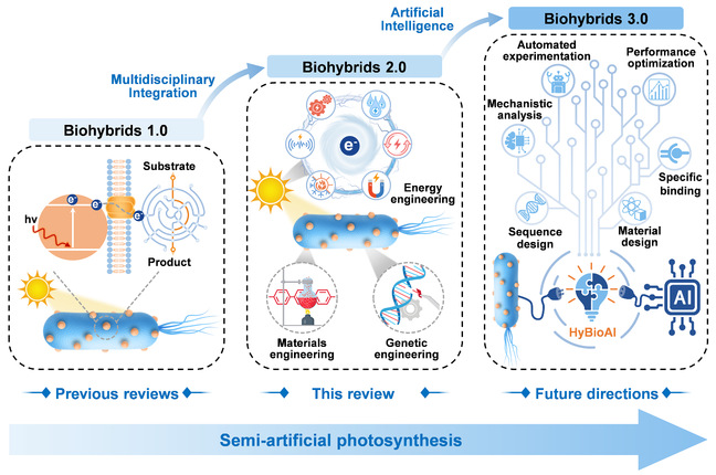 基于微生物与纳米材料的多样化结合,半人工光合作用在过去十年取得了显著进展,催生了第一代全细胞生物杂化系统(Biohybrids 1.0)。然而,对于该系统的概念及能量转化机制,尤其是在三大核心组成部分——光敏剂、微生物以及太阳能——的优化策略方面,仍缺乏系统性总结。为填补这一空白,本综述系统阐述了新一代生物杂化系统(Biohybrids 2.0)开发的多学科工程策略,重点介绍光敏剂设计、微生物筛选与工程改造、能量来源及转化、生物–无机界面调控,以及相关表征方法开发的最新进展,并对跨学科应用进行了系统梳理。文章还对该领域研究的现有局限性进行了批判性分析,并提出未来研究方向,有望推动Biohybrids 3.0的突破性发展。总体而言,本综述为半人工光合作用系统的设计与优化提供了明确框架,有助于构建高效、稳健且具工业应用潜力的太阳能–化学能转化平台。