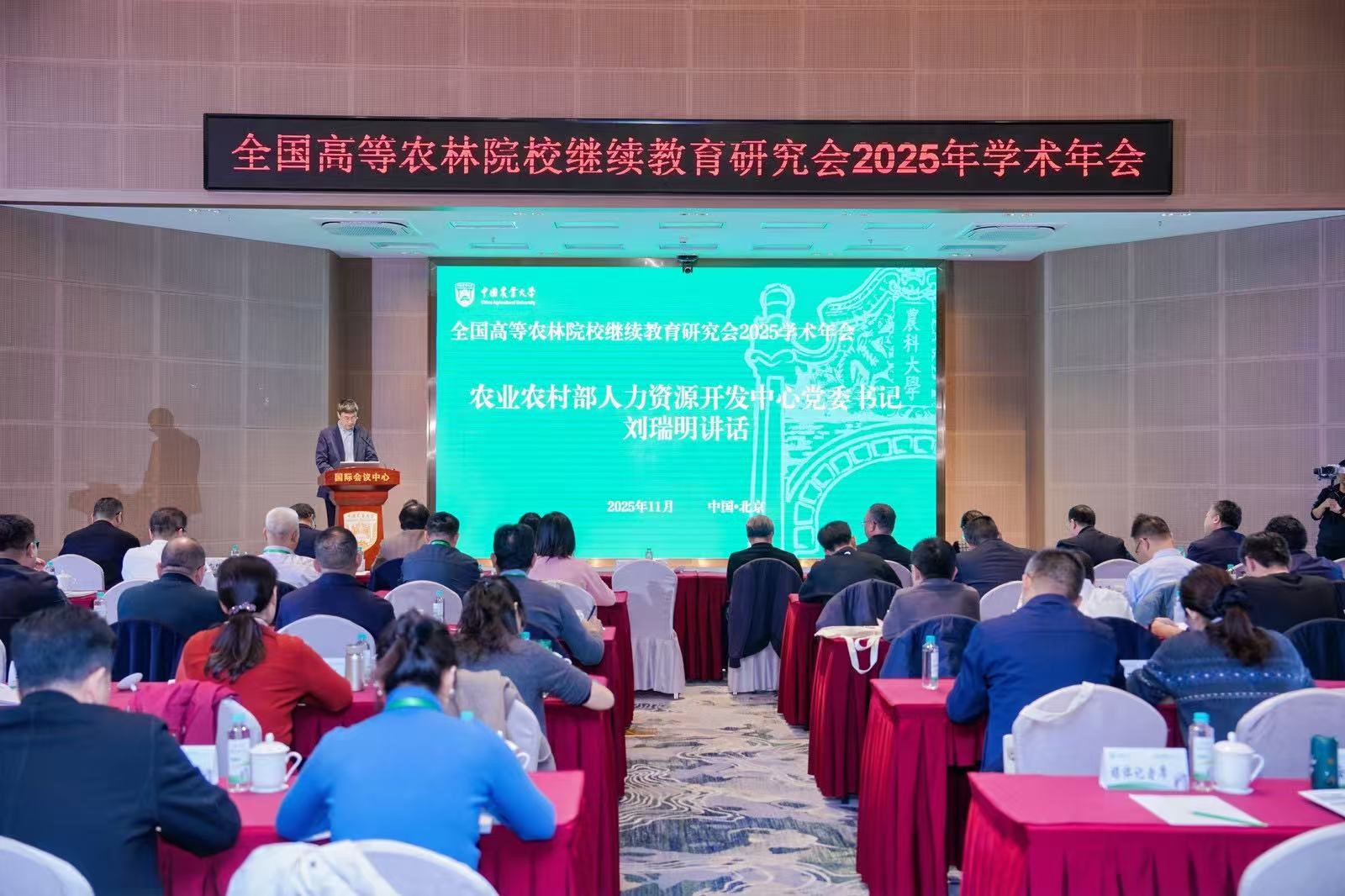 11月17日至19日,全国高等农林院校继续教育研究会2025年学术年会在中国农业大学隆重召开。农业农村部人力资源开发中心党委书记刘瑞明、教育部职业教育与成人教育司高等继续教育处副处长(主持工作)徐璐、中国农业大学党委常委、副校长林万龙等领导嘉宾出席会议,全国各高等农林院校代表齐聚一堂,共商数智时代继续教育创新发展路径,共话乡村振兴人才培育使命。永利集团88304官网在线登录乡村振兴学院(继续教育学院)副院长(主持工作)范胜龙、副院长李文灿、教育融合专员刘飞翔参会,以高质量继续教育发展成果、优质主题报告、创新“头雁”培育展板,赢得兄弟院校广泛关注与高度认可。