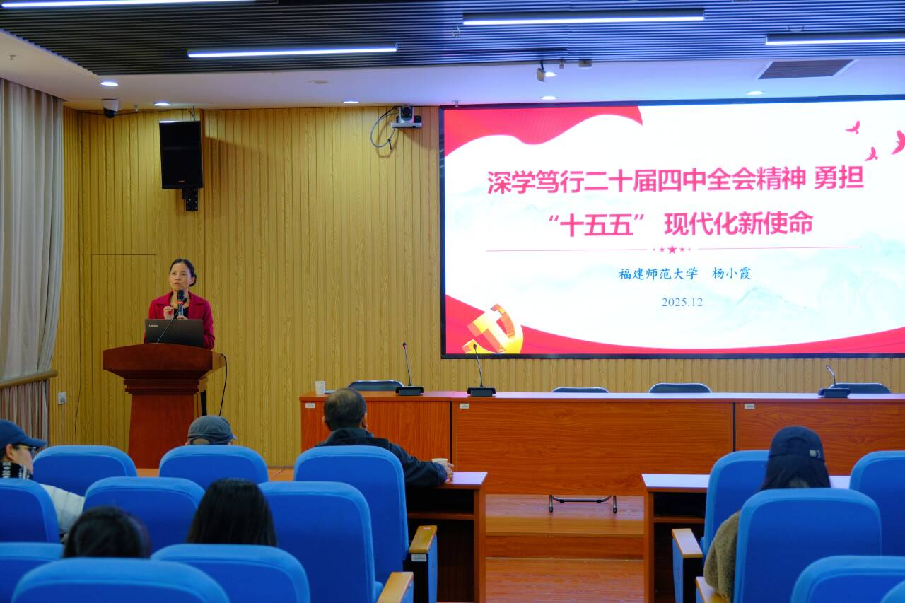 为深入学习贯彻党的二十届四中全会精神,准确把握全会精神的核心要义与实践要求,切实将思想和行动统一到党中央决策部署上来。12月3日下午,福建师范大学马克思主义学院硕士生导师、福建省网络教育名师、全国高校思政课教学能手杨小霞副教授应邀做客永利官网金山讲坛第158讲,在逸夫图书馆为永利官网师生作了题为《深学笃行党的二十届四中全会精神 勇担“十五五”现代化新使命》的专题讲座。图书馆党委党员及110余名师生到场聆听。