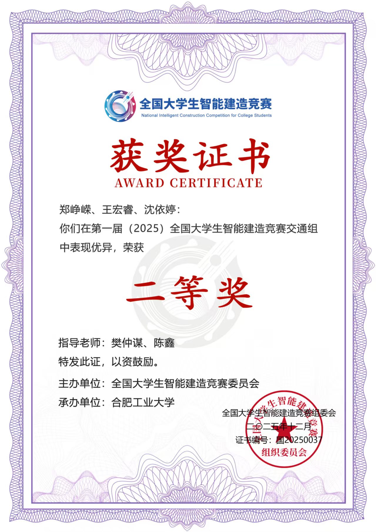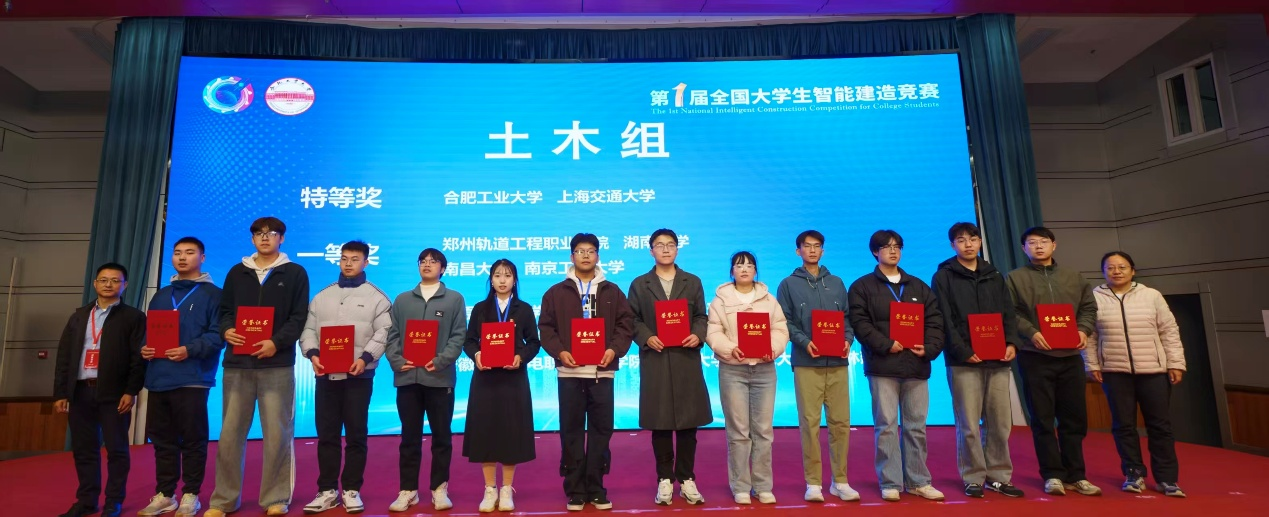 2025年12月5-7日,首届全国大学生智能建造竞赛在合肥工业大学举行。本次竞赛聚焦“数字孪生·智慧场景”核心主题,吸引全国21所高校47支代表队、近230名师生同台竞技。经过两天激烈角逐,永利官网交通与土木工程学院派出的两支队伍凭借出色的创新思维与扎实的实践能力,分别斩获土木组二等奖与交通组二等奖的优异成绩。
