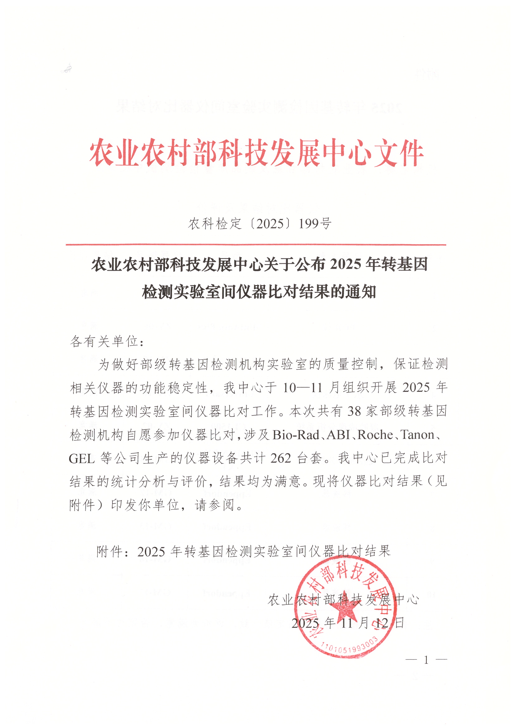 转基因生物成分检测能力验证是评价转基因检测机构检测能力的关键环节。本次能力验证涵盖转基因定性与定量检测项目,中心严格遵循标准操作流程,确保数据准确可靠,按时完成检测任务并提交检验报告。经考核评估,中心获评“满意”等级,农业农村部科技发展中心颁发了证书。充分彰显了中心在转基因检测领域的技术优势与质量管理水平。