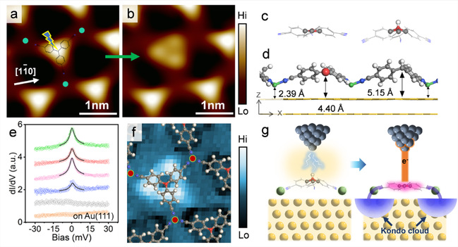 图1 (a) 针尖诱导脱氢前的Ni-TPM的STM图。(b) 脱氢后的Ni-(d-TPM)的STM图。(c、d) Ni-(d-TPM) (左)和Ni-TPM (右)在真空中(c)和Au(111)表面上(d)的弛豫原子结构侧视图。(e)d-TPM分子上的dI/dV谱。(f) 实验观测到的近藤云空间分布。(g) 针尖诱导脱氢以及间接近藤屏蔽机制示意图。