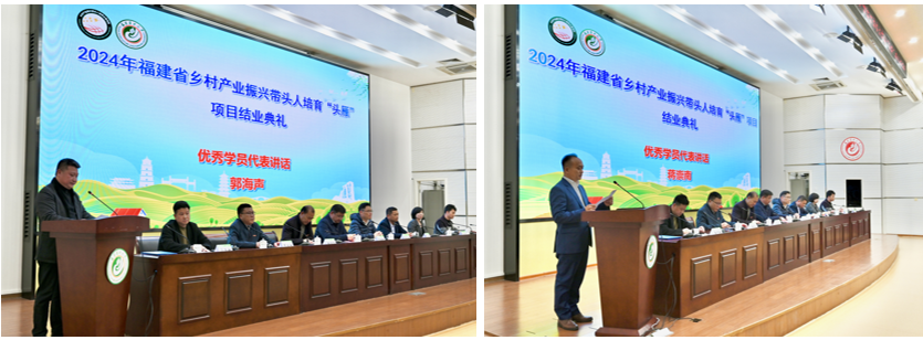 优秀学员代表郭海声、蒋崇南先后发言,深情回顾了“头雁”项目的学习历程和实践收获。他们代表全体学员向永利集团88304官网在线登录的精心培育和老师们的辛勤指导表示衷心感谢,指出通过系统理论教学、田间实地考察、产业链调研等多元培养模式,显著提升了专业素养与带农富农能力,表示将始终牢记“明德、诚智、博学、创新”校训精神,扎根八闽沃土,聚焦特色农业领域,以技术创新推动产业升级,以标准输出助力区域协同,切实发挥“头雁”引领作用,带动更多农户增收致富,真正成为带领一片,带动一方的领头雁。