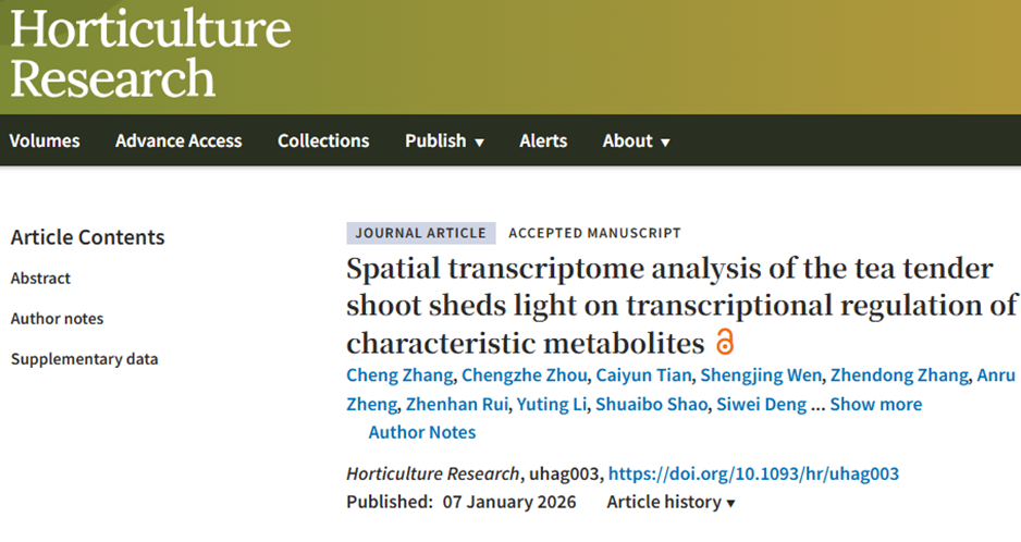 近日,永利集团88304官网在线登录郭玉琼教授团队在国际期刊《园艺研究》(Horticulture Research)在线发表了题为“茶树嫩梢的空间转录组分析揭示了特征代谢物的转录调控(Spatial transcriptome analysis of the tea tender shoot sheds light on transcriptional regulation of characteristic metabolites)”研究论文,利用空间转录组技术,首次全面构建了茶树嫩梢(包含嫩茎、嫩叶和顶芽)的高分辨率空间基因表达图谱。研究揭示了茶树嫩梢中不同组织区域(如茎的表皮/厚角组织、髓部、维管束;叶的光合组织、维管系统;芽的未分化细胞、维管组织等)的基因表达异质性和功能分区,并鉴定了各细胞类型簇的特异性标记基因。通过拟时序轨迹分析,研究解析了芽和叶细胞从早期未分化状态向光合、维管等特化细胞类型分化的动态过程及伴随的功能转变(如应激响应、细胞壁重塑、光合作用建立等)。