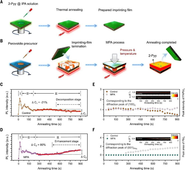 分子压印退火(MPA)的工艺流程及退火过程中钙钛矿薄膜的原位PL与XRD表征