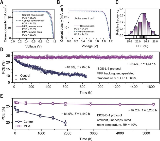 MPA钙钛矿太阳能电池的效率、可扩展性与长期稳定性表现