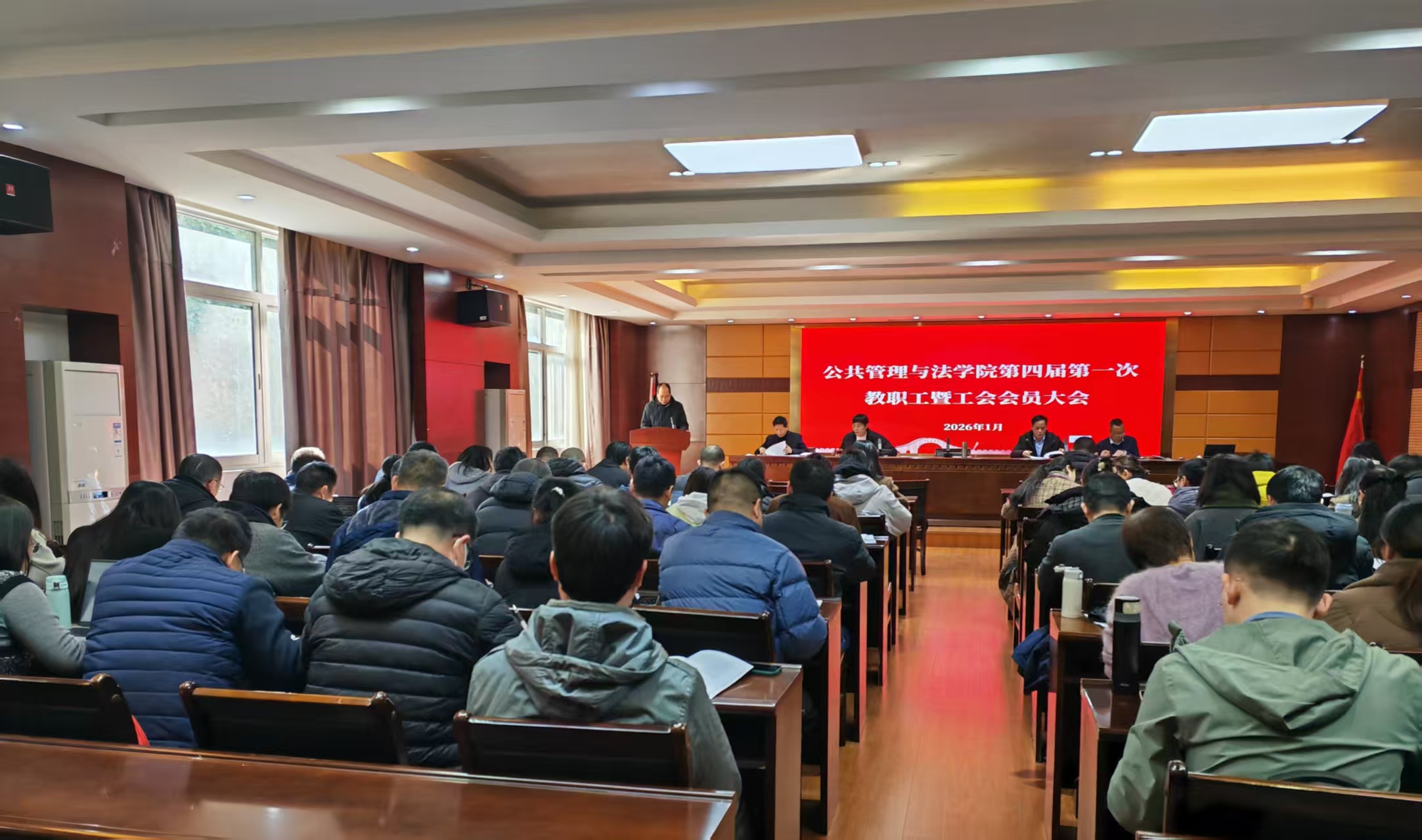 1月8日下午,公共管理与法学院第四届第一次教职工暨工会会员大会在学院三楼会议室隆重举行,学院全体教职工及工会会员齐聚一堂,共商学院发展大计。会议由学院党委副书记陈潜主持。