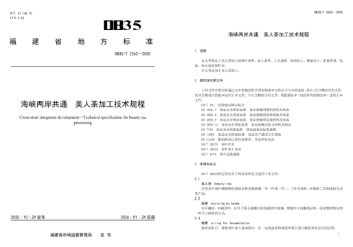 近日,福建省市场监督管理局正式发布公告,批准《海峡两岸共通 美人茶加工技术规程》等29项福建省地方标准,并于2026年1月24日正式实施。该标准明确美人茶加工全流程规范,从鲜叶原料筛选、加工环境要求、初制和精制工艺技术参数、到质量管控和包装贮存细节,实现两岸技术标准的协同统一。
