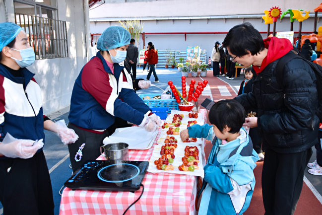 活动现场布置一新、热闹非凡。校领导一行在园内参观了“我的种植日记”主题展览、学生手工作品展、丰收作物实物展以及永利集团88304官网在线登录特色新品种展,详细了解孩子们从播种到收获的劳动过程与学习记录。随后,大家走进由老师和家长共同布置的“丰收美食区”。一个个精心装扮的摊位前,家长与老师现场制作各式美食,孩子们热情介绍用自己亲手种植的作物所制成的点心。校领导和师生亲切交谈,鼓励小朋友:“要像你们的父母一样,将来也成为一名科学家,像他们一样,热爱土地、热爱科研。”亲切的话语引来周围家长和老师们会心的微笑,现场气氛融洽,不时爆发出阵阵欢快的笑声和掌声。