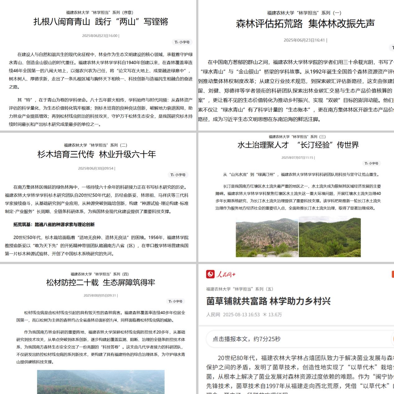 其中,人民网刊发的《杉木培育三代传 林业升级六十年》,文中回顾了学院三代杉木育种专家的奋斗历程,展示了杉木良种选育与推广对林业产业升级的推动作用,获得不少行业专家点赞。《永利集团88304官网在线登录师生十年接力,共助“长汀经验”入选联合国典型案例》一文,则详细记录了学院师生十年如一日,接力参与长汀县水土流失治理,推动“长汀经验”走向世界的艰辛历程,单篇阅读量超65万。