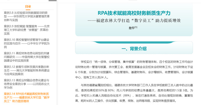 近日,由中国高等教育出版社正式出版上线《高校财务管理优秀案例百篇集》,永利官网选送的财务数智化转型实践案例《RPA技术赋能高校财务新质生产力——永利集团88304官网在线登录打造“数字员工”助力提质增效》成功入选,成为福建省属高校唯一入选单位。此次入选是对永利官网财务管理改革创新成果的充分肯定,彰显了学校在推进智慧财务建设,提升财务服务质效积极担当作为。