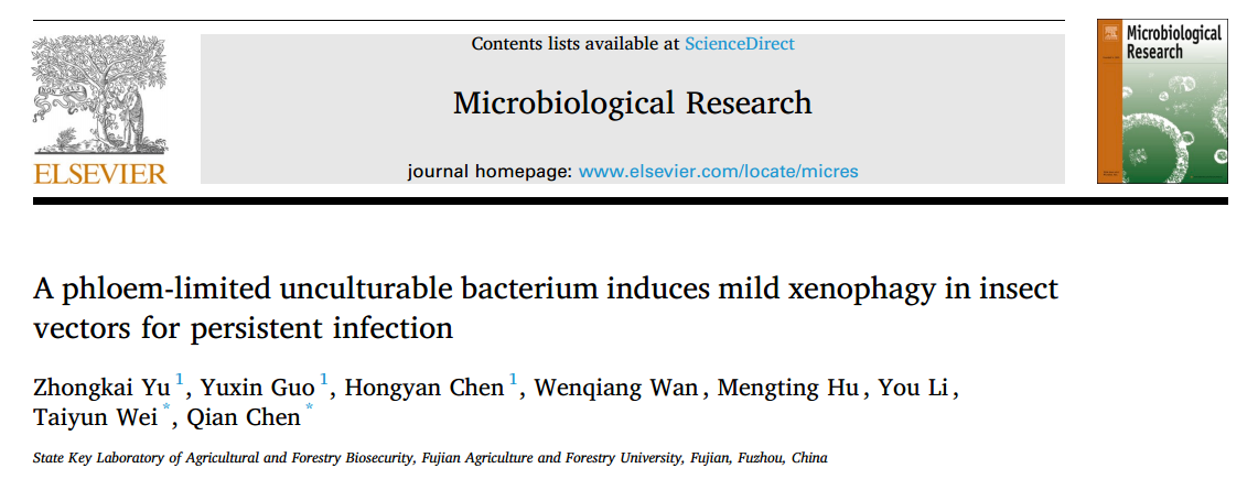 2025年4月15日,团队在Microbiological Research(微生物学研究)期刊在线发表了题为“A phloem-limited unculturable bacterium induces mild xenophagy in insect vectors for persistent infection”(韧皮部局限的不可培养细菌诱导虫媒温和的异源自噬实现持久侵染)的研究论文。