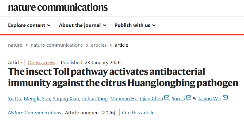 2026年1月23日,团队在国际知名期刊Nature Communications(自然通讯)上发表题为“The insect Toll pathway activates antibacterial immunity against the citrus Huanglongbing pathogen”( 昆虫Toll通路激活针对柑橘黄龙病菌的抗菌免疫反应)的研究论文。该研究揭示了CLas拮抗虫媒柑橘木虱Toll受体引发的免疫信号通路,建立持久侵染的分子机制,为深入理解病原传播规律,并发展新型靶向防控策略,提供了重要理论依据。
