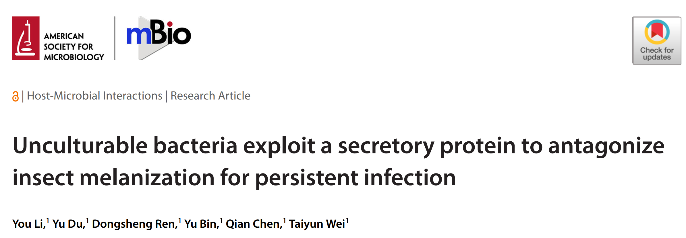 2025年8月29日,团队在mBio杂志发表了题为“Unculturable bacteria exploit a secretory protein to antagonize insect melanization for persistent infection”(不可培养细菌利用分泌蛋白拮抗昆虫黑化反应以实现持久侵染)的研究论文。