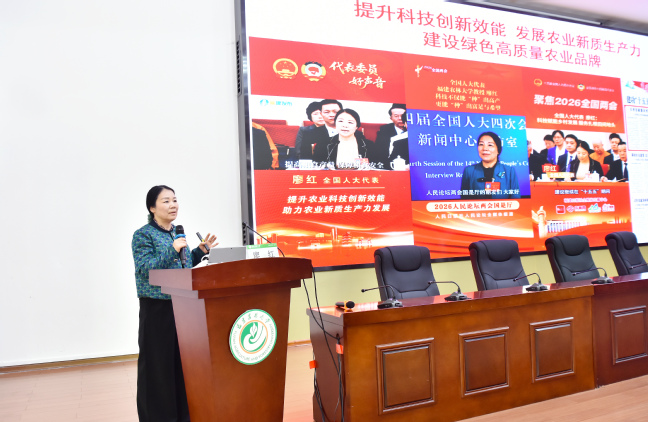 报告中,廖红结合参加全国两会的亲身经历,系统传达了大会的主要精神、亮点特色以及重要成果,特别是对政府工作报告中关于教育、科技、人才以及“三农”工作的新部署、新要求进行深入解读。她谈到,国家持续把“三农”工作作为重中之重,未来农业将向科技农业、绿色农业、质量农业、品牌农业转型。作为科技工作者,要着力提升科技创新效能,发展农业新质生产力,建设绿色高质量农业品牌。结合自身植物营养与酸性土壤改良研究,廖红以燕子窠生态茶、“岩柚”文旦柚、“东越王”稻米等品牌打造为例,分享了团队通过土壤改良、精准施肥、绿色栽培等关键技术,破解茶叶品质提升、柚类木质化与裂果、水稻低产等产业发展难题,把前沿科技、高深理论,转化为老百姓看得见、摸得着的增收实效的故事,并表示将继续致力保护土壤,把更多好技术送到田间地头,用科技力量绘就农业绿色、高产、优质、生态协同发展的新画卷。