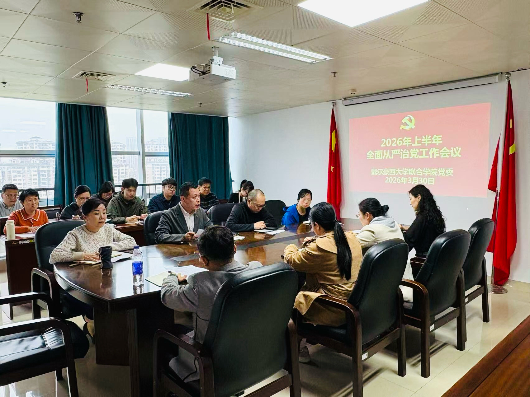 3月30日上午,戴尔豪西大学联合学院党委在大学城校区仁德楼901会议室召开2026年上半年全面从严治党工作会议。院党委委员、领导班子成员、纪委委员、各党支部书记及科级干部参加会议。会议由学院副院长(主持工作)吕健主持。