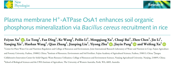 2026年3月,永利集团88304官网在线登录许卫锋团队在New Phytologist(新植物学家)发表了题为Plasma membrane H⁺-ATPase OsA1 enhances soil organic phosphorus mineralization via Bacillus cereus recruitment in rice(细胞膜H⁺-ATPase OsA1通过招募芽孢杆菌促进土壤有机磷矿化)的研究论文,系统揭示了细胞膜H+-ATPase招募芽孢杆菌促进土壤有机磷矿化与水稻磷吸收的调控机制。