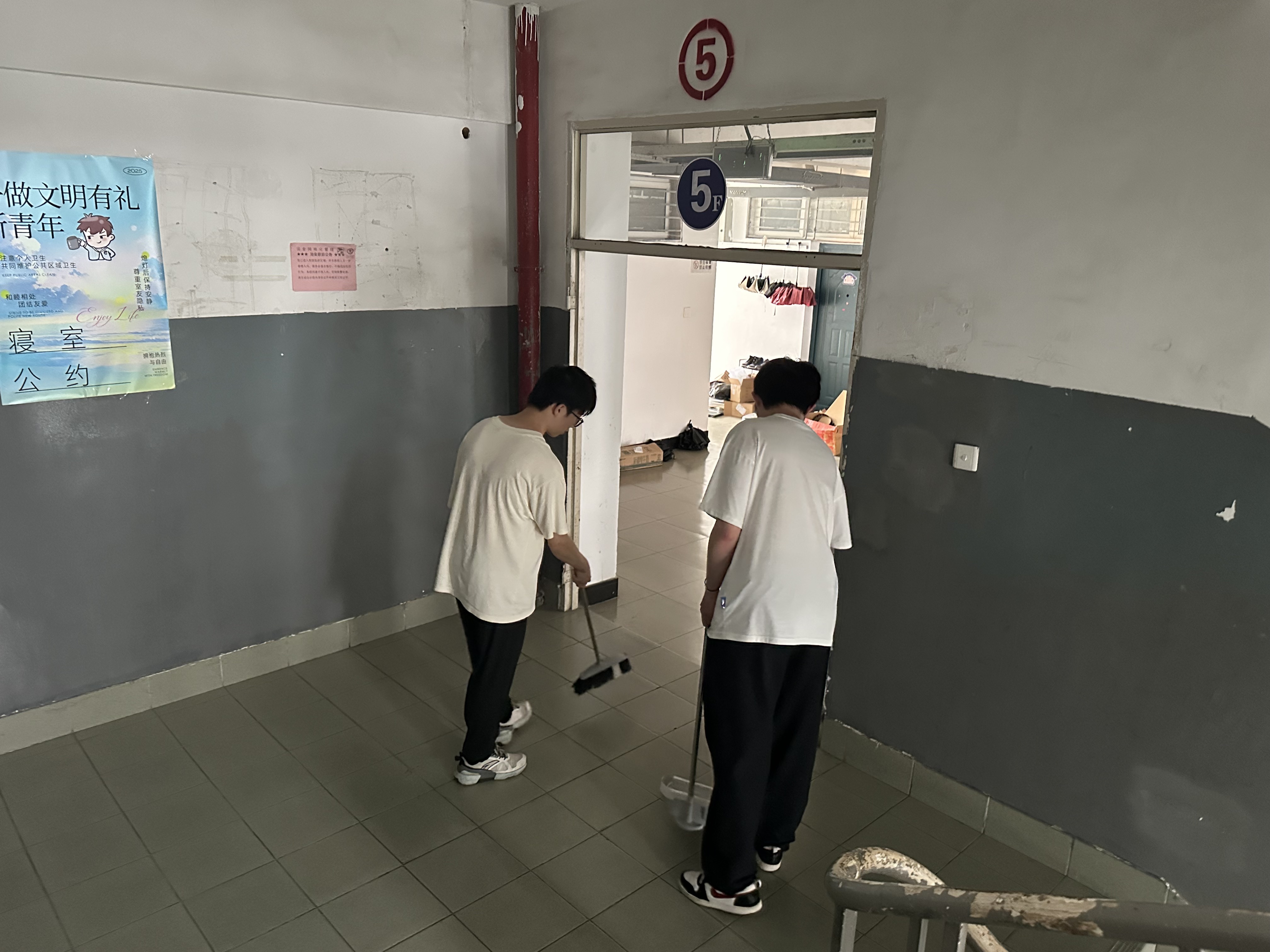 活动现场,参与活动的同学们分组前往各宿舍区开展清洁工作。大家手持扫帚、抹布、拖把等工具,对楼道地面、楼梯扶手、台阶缝隙、公共饮水机机身及周边区域、消防通道出入口等公共部位逐一进行清扫擦拭,认真清理楼道内堆放的废弃杂物、快递包装,擦拭墙面与墙角积灰。整个过程中,同学们各司其职、协作有序,以实际行动改善宿舍区公共环境面貌,切实为共建整洁舒适的“一站式”学生社区贡献力量。