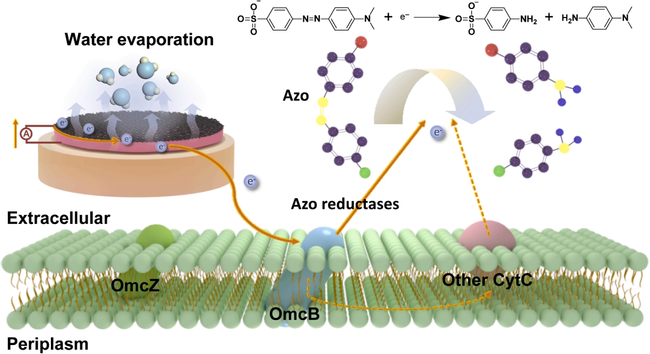 研究首次提出基于微生物生物膜的原型污水处理装置(mBio-HS),仅依靠水蒸发过程驱动电子供应,无需任何外部能量输入,即可稳定输出约20 μA的电流和0.3 V的电压。以偶氮染料甲基橙为模型污染物,该系统在72小时内实现90%的脱色率,并表现出良好的循环使用稳定性。该工作证实了利用环境中普遍存在的水伏效应为氧化还原反应提供动力的机制基础,为深层土壤、地下水等寡营养环境中的绿色低碳生物修复提供了切实可行的技术路径。